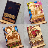 These are hand-assembled, multi-layered 3D wooden trading card replicas designed after the Leader editions found in the popular One Piece anime trading card game. Each card is carefully laser cut, engraved, and hand-painted to highlight the detailed artwork and stylized background.