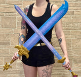 Bolder and more intricate, this later-stage form is wider with vivid blue ombré shading and embossed detailing, framed by an intricate gold hilt. It embodies the full force of Rumi's evolved strength.