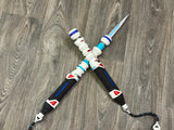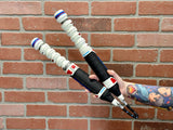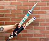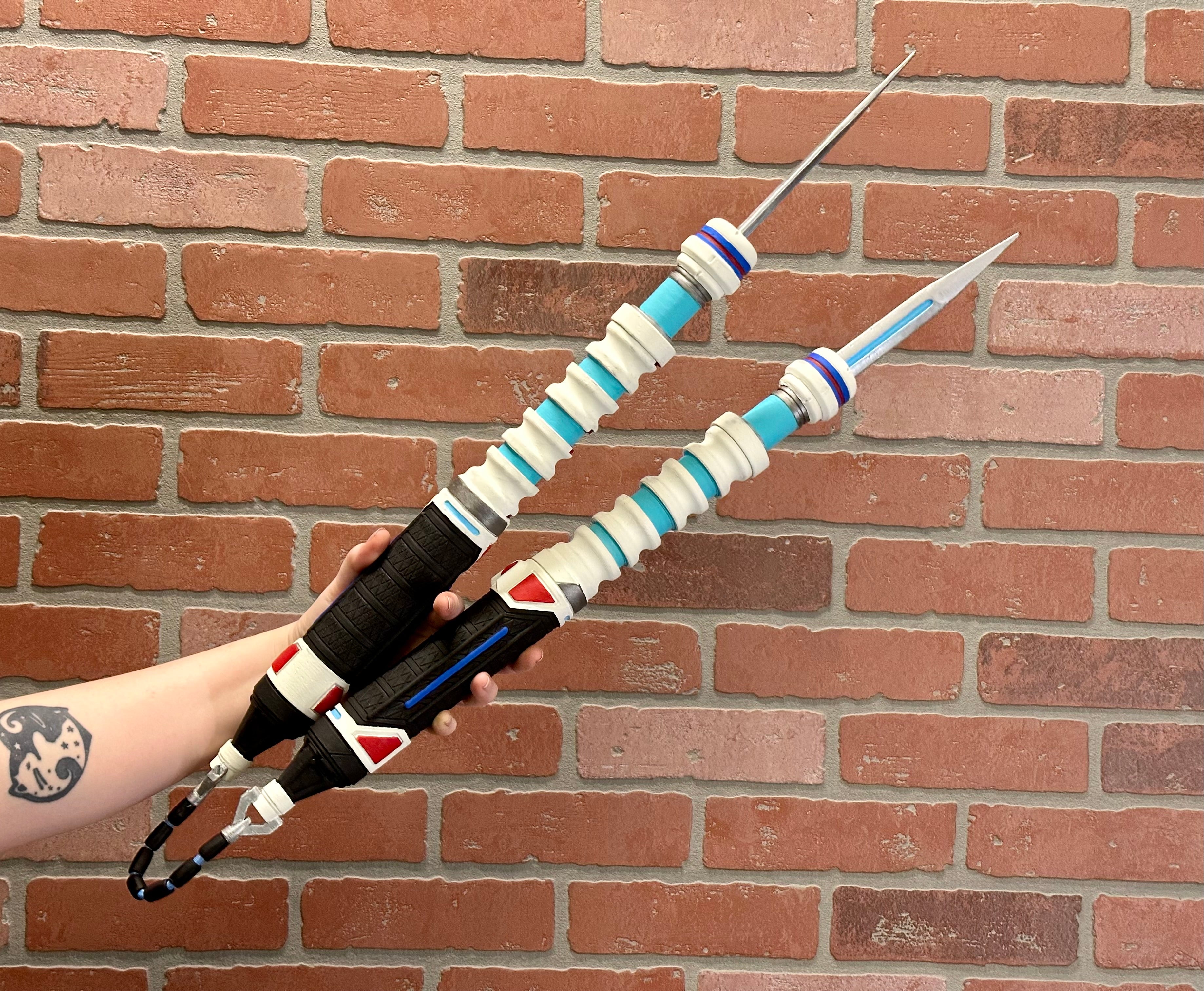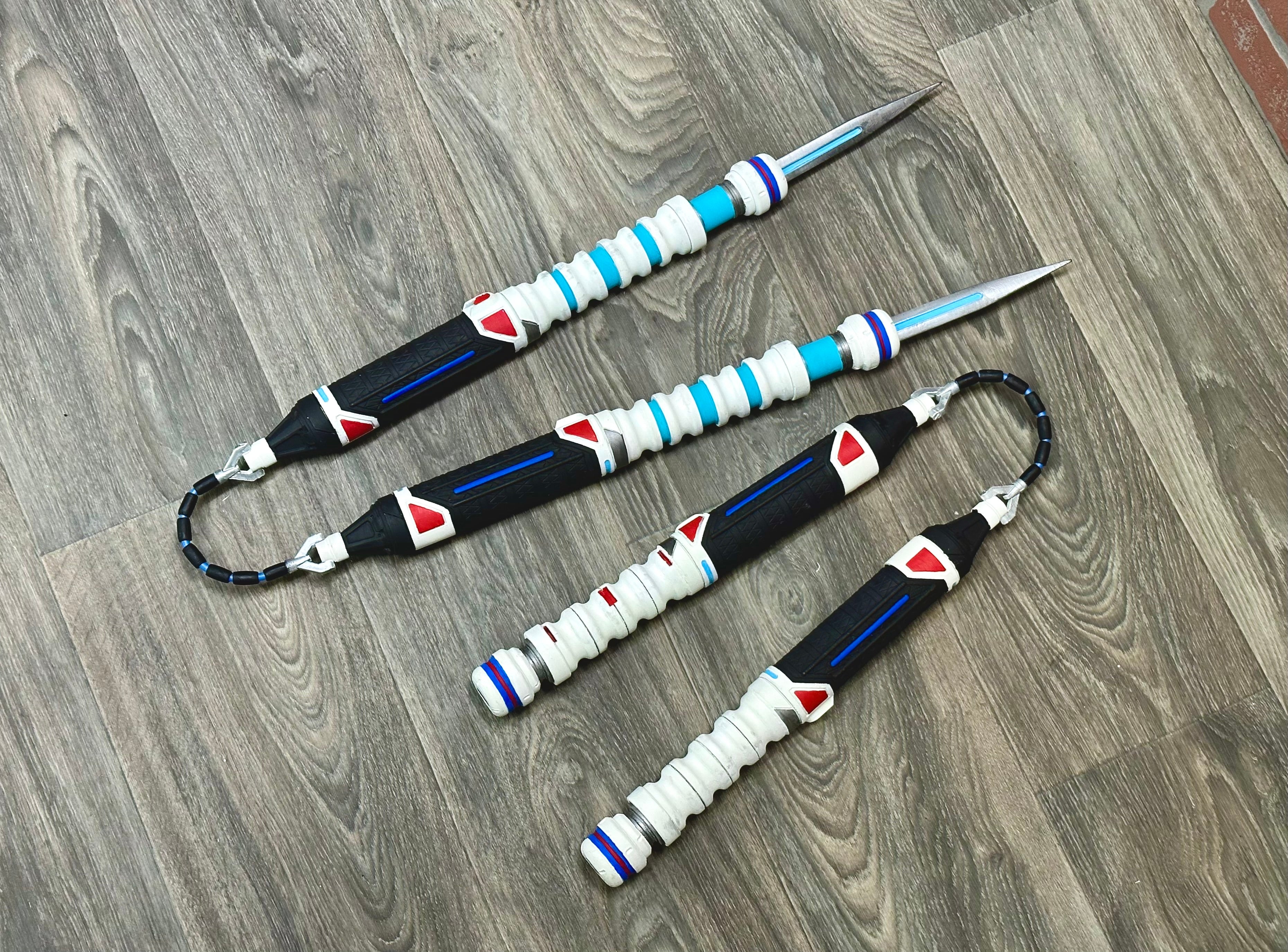This is an entirely hand-painted, full-scale 3d printed prop inspired by the heirloom wielded by the incisive instigator, Ash. There are two forms available for each of the ends of the nunchucks; with or without the bladed ends. With the bladed version, the rod has a total length of 25.5 inches while the non-bladed version has a length of 17 inches. They are tethered together by a flexible decorated cord that is 5-6 inches long to allow for ample amount of elastic movements. Please be aware that the blades will be rounded off for the sake of safety and I wouldn't recommend hitting things with these (no matter how tempting it may be to swing them around) to avoid damaging the item, others and yourself. It is super lightweight as well so it's easy to carry around at conventions while looking absolutely awesome. This is the perfect gift for anyone who loves the game and the character!