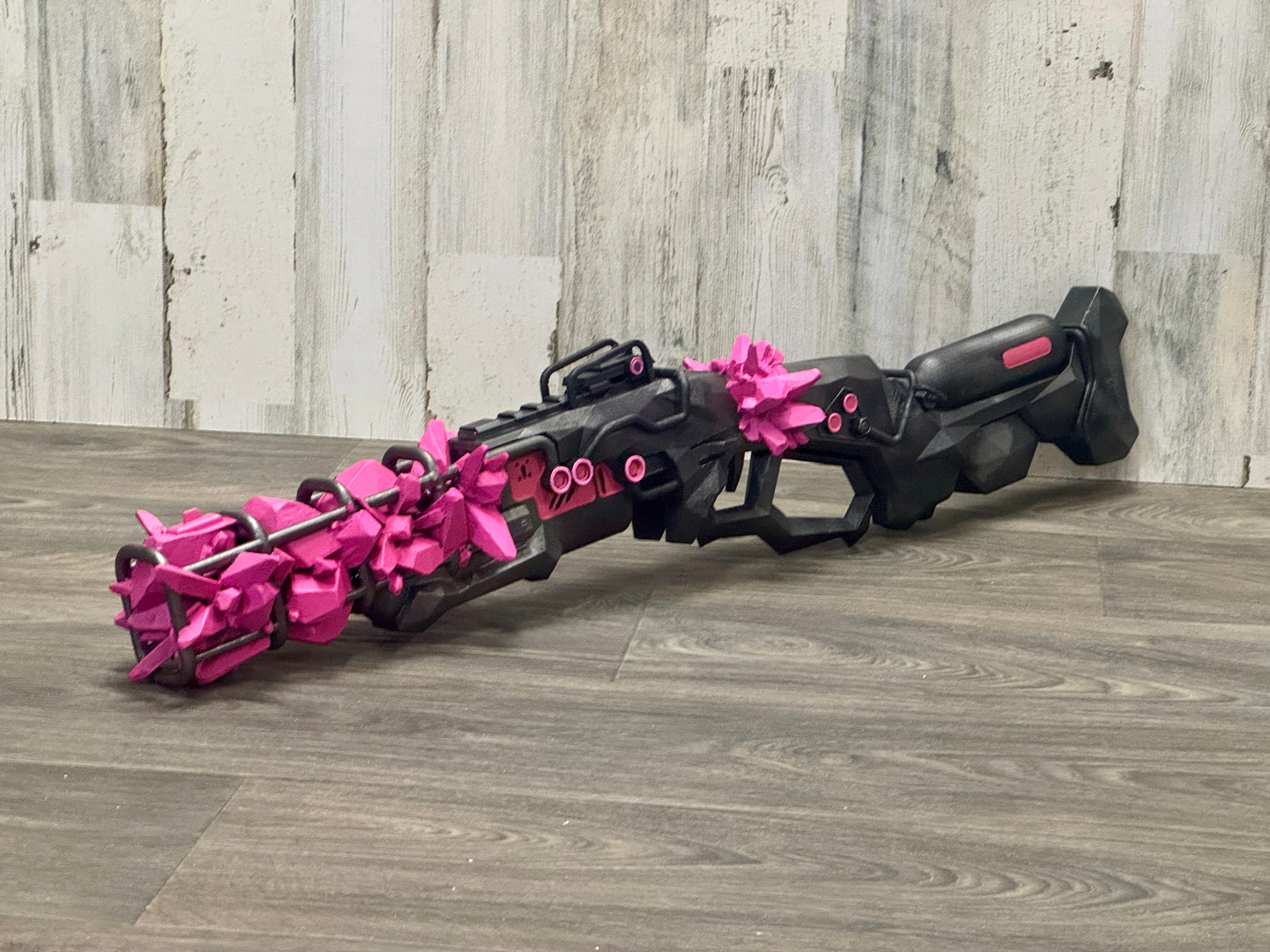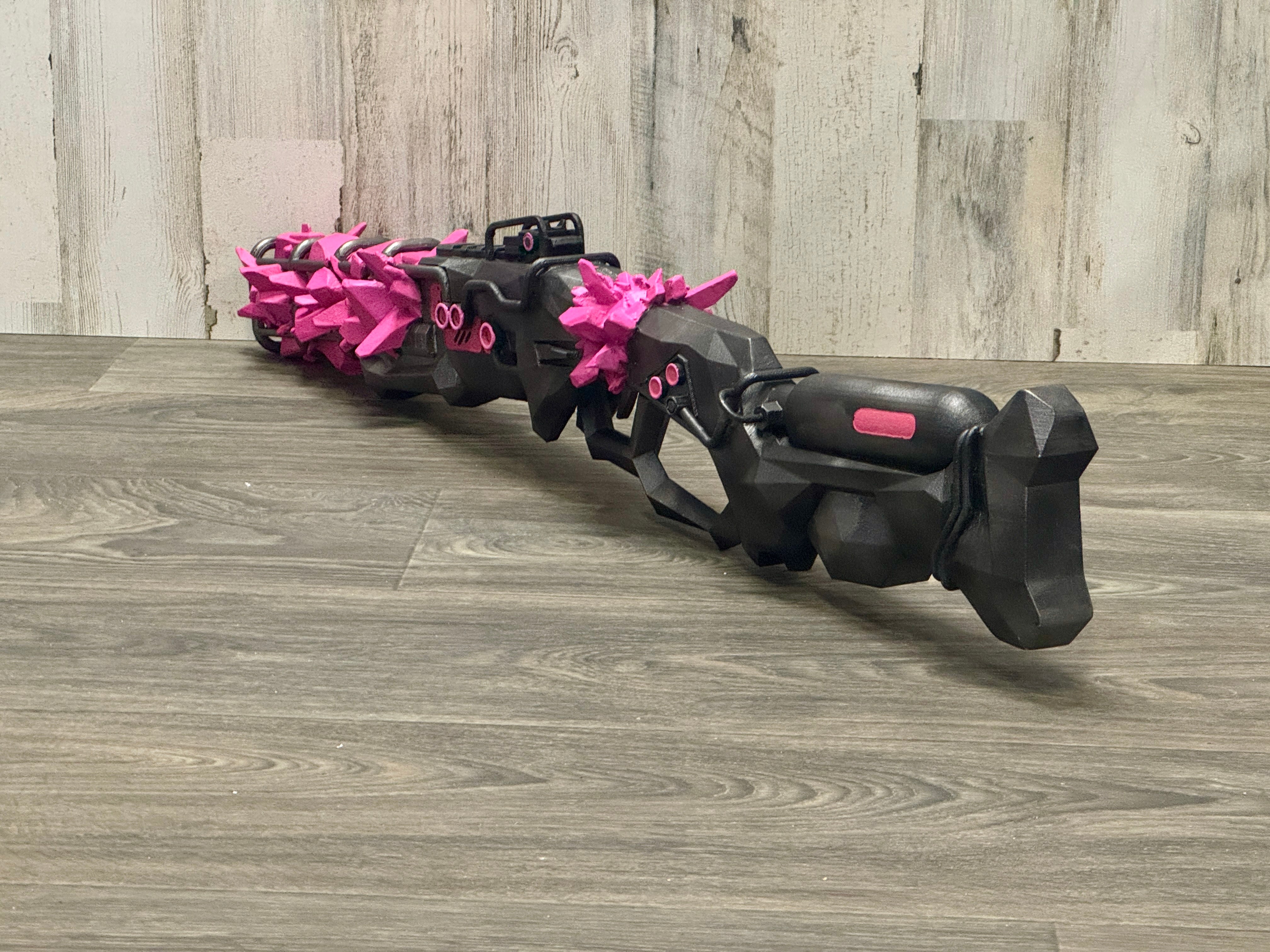This is an entirely hand-painted, full-scale 3D-printed prop inspired by the Bloodstone Peacekeeper skin from Apex Legends. Featuring angular, gem-like details and a dark crystalline finish, this replica brings the in-game weapon to life with bold visual texture and stylized elements true to the original cosmetic.