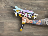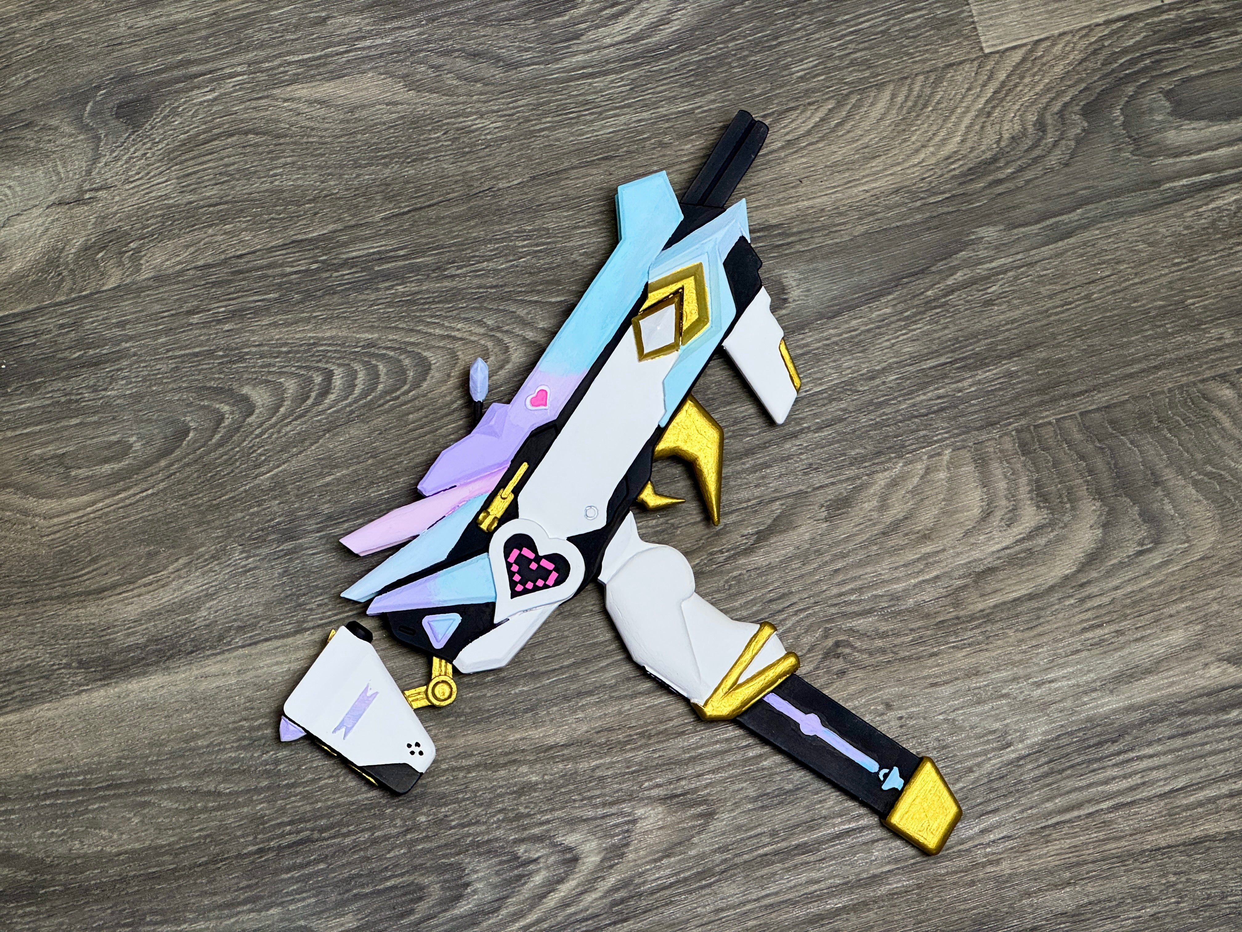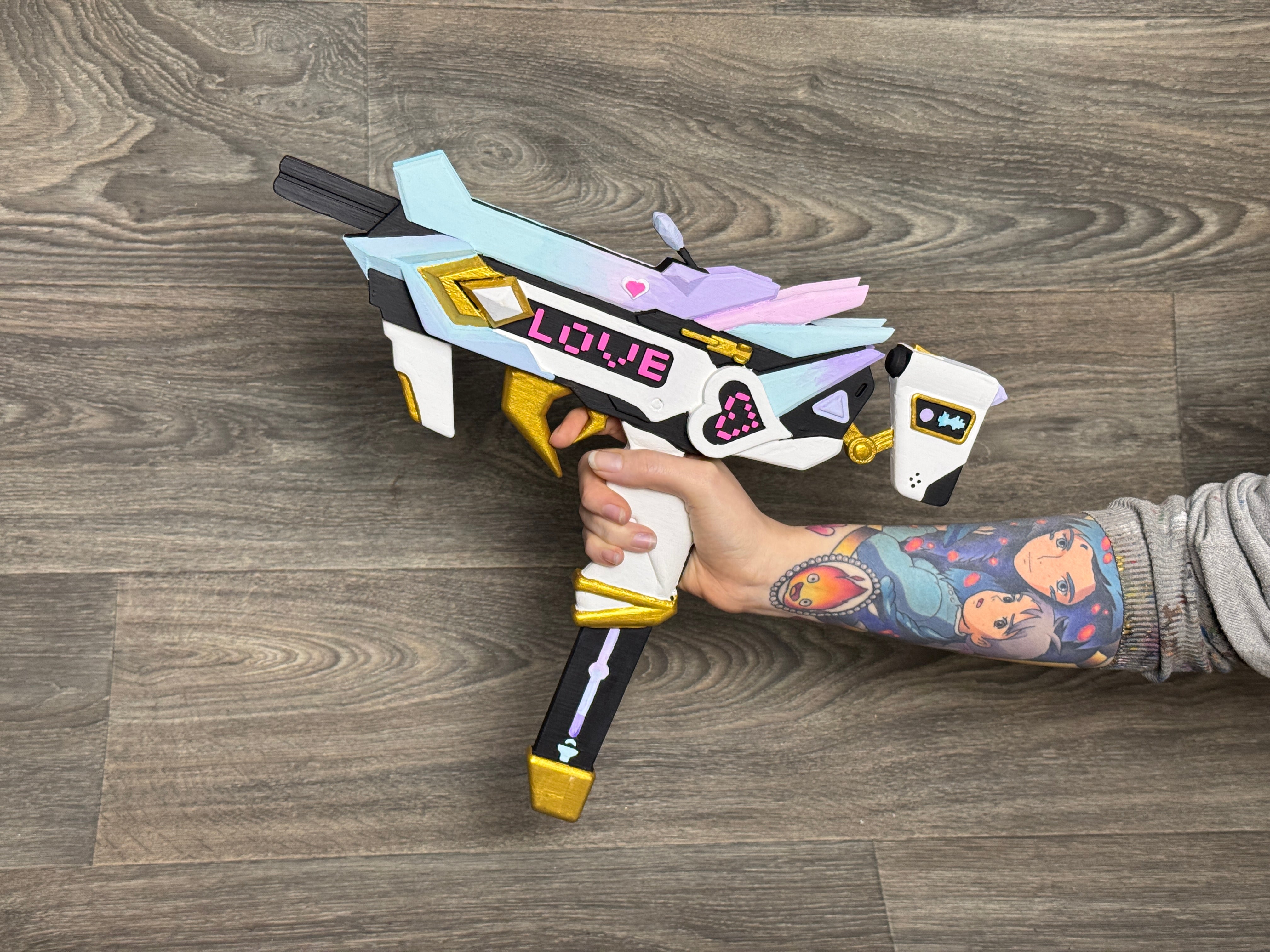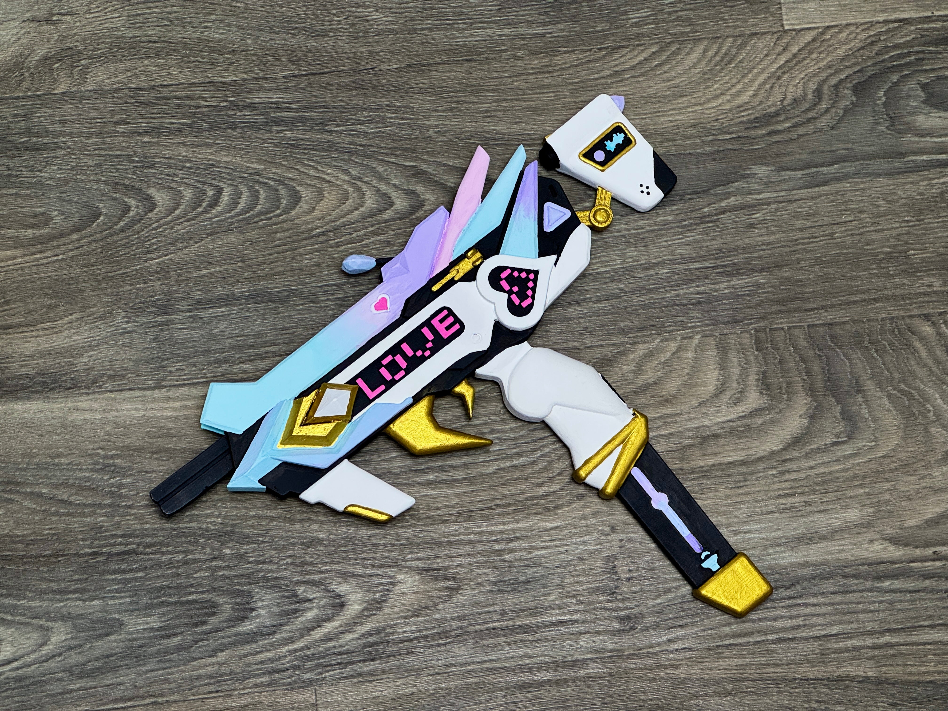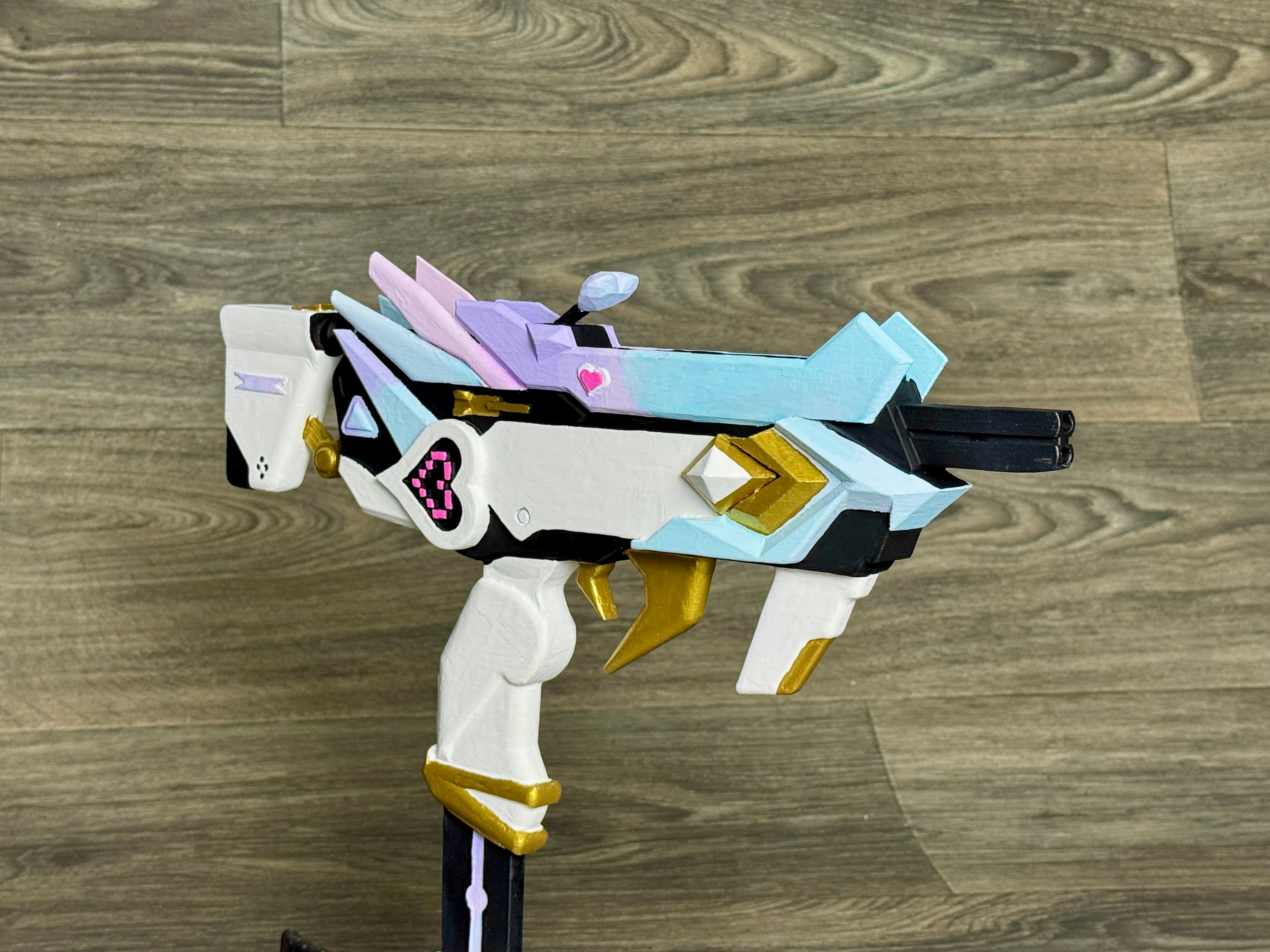 This is an entirely hand-painted, full-scale 3D-printed prop inspired by Sombra’s Antifragile Slay Star SMG from the Overwatch x Le Sserafim collaboration. With its bold pastel palette, gold accents, and pixel heart detail, this replica captures all the flair and personality of the in-game skin.
