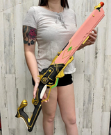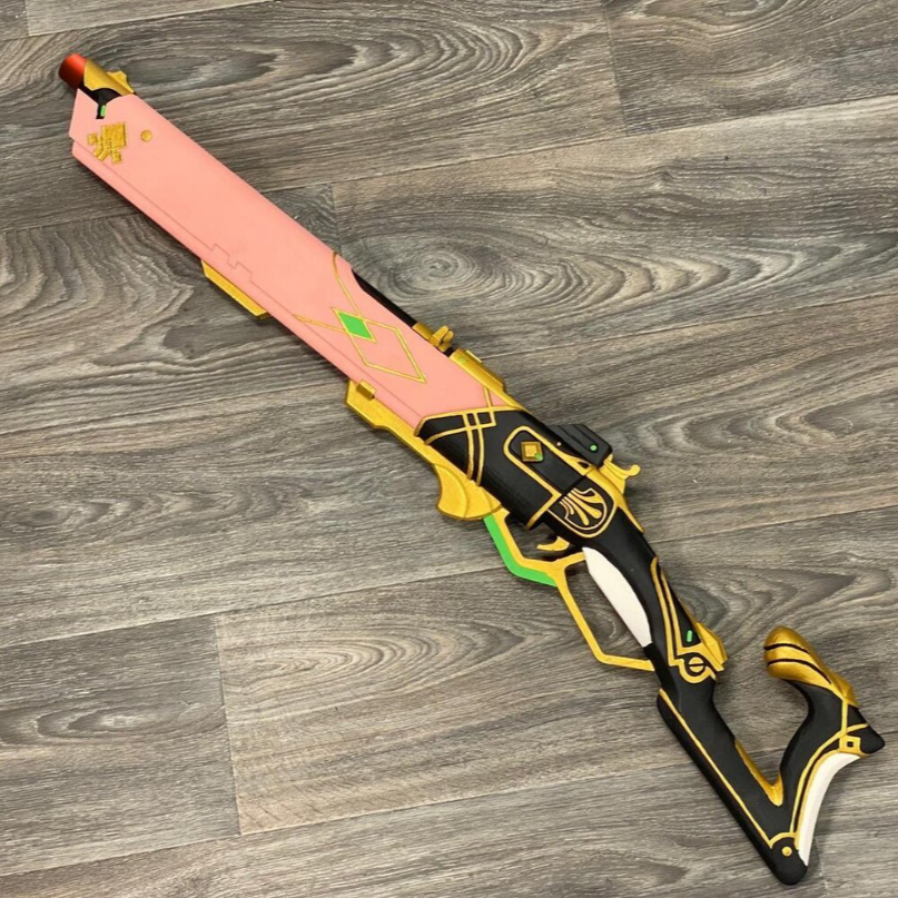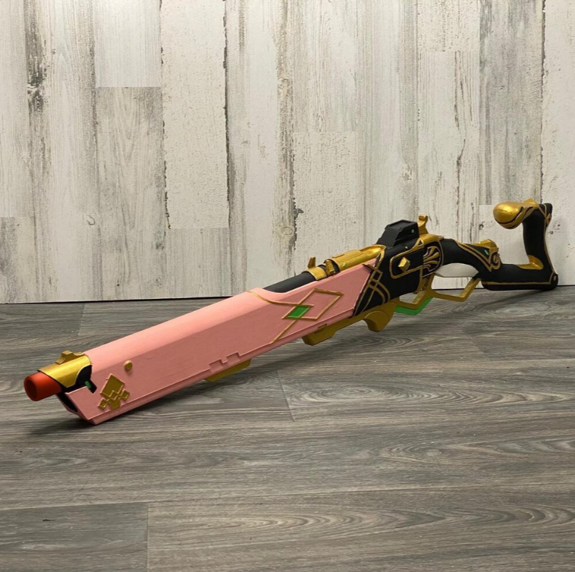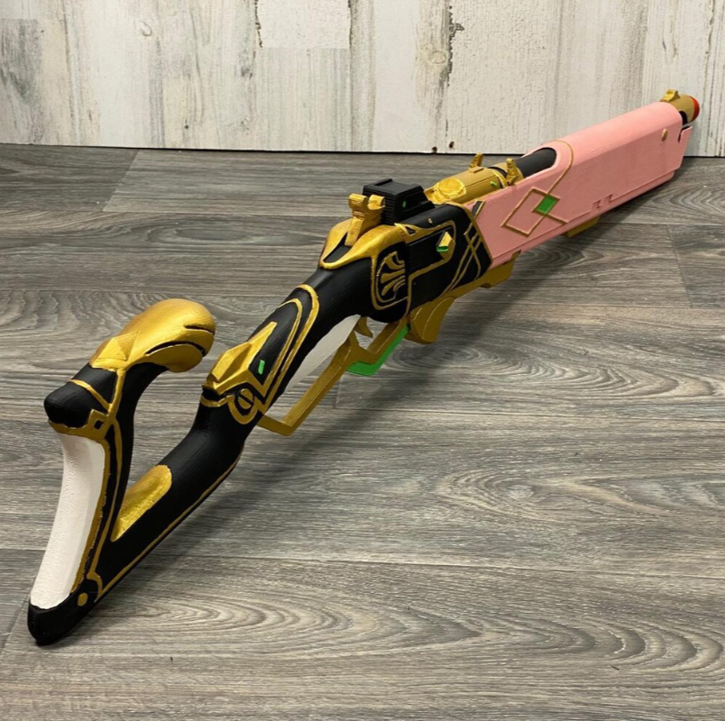 This is a full scale, entirely 3d Printed replica inspired by the character Ashe's gun. Made of abs plastic, this is very durable and fully hand painted and coated to last. This is a highly detailed model that is perfect for cosplay and display purposes. There is a painted and unpainted version of this and it comes completely assembled! The painted is as photographed and the unpainted is the same shape and size, only all white instead for you to paint yourself!