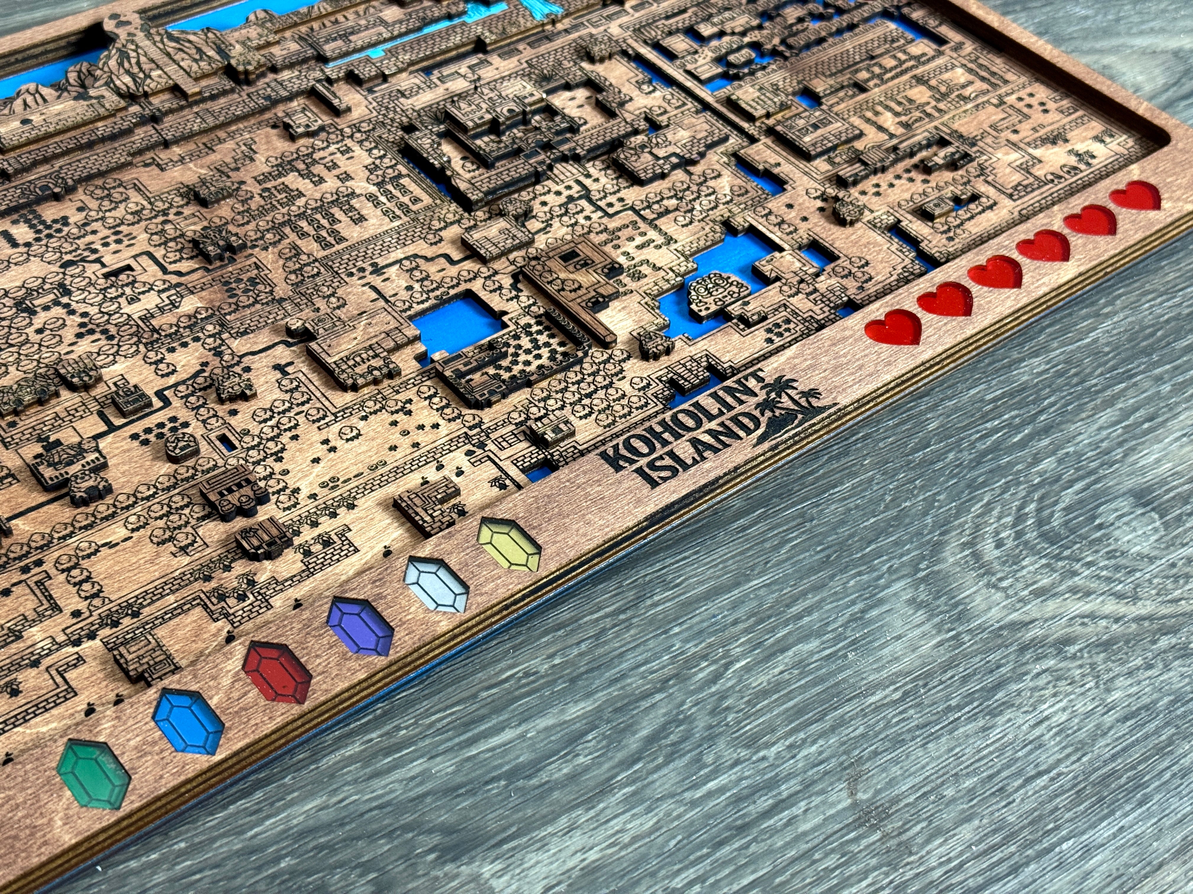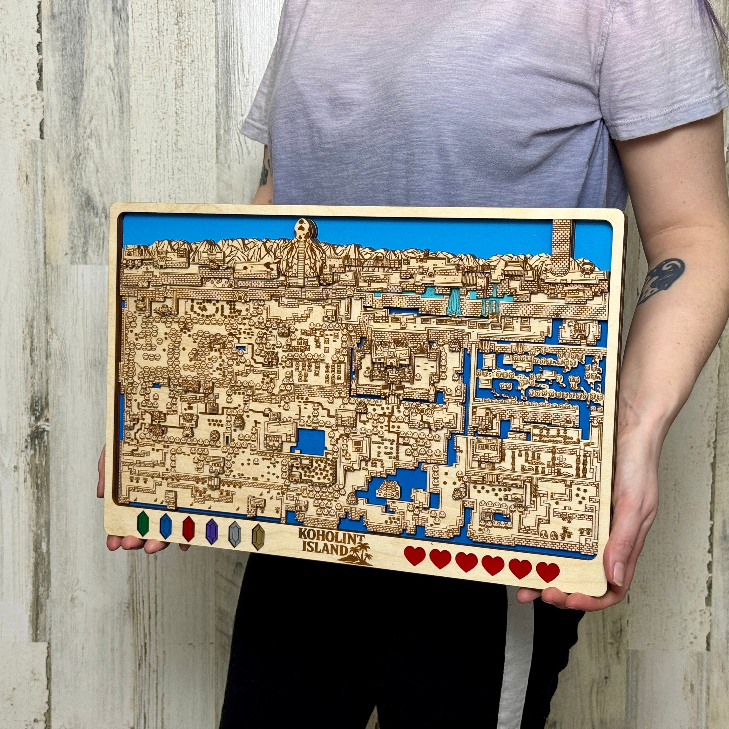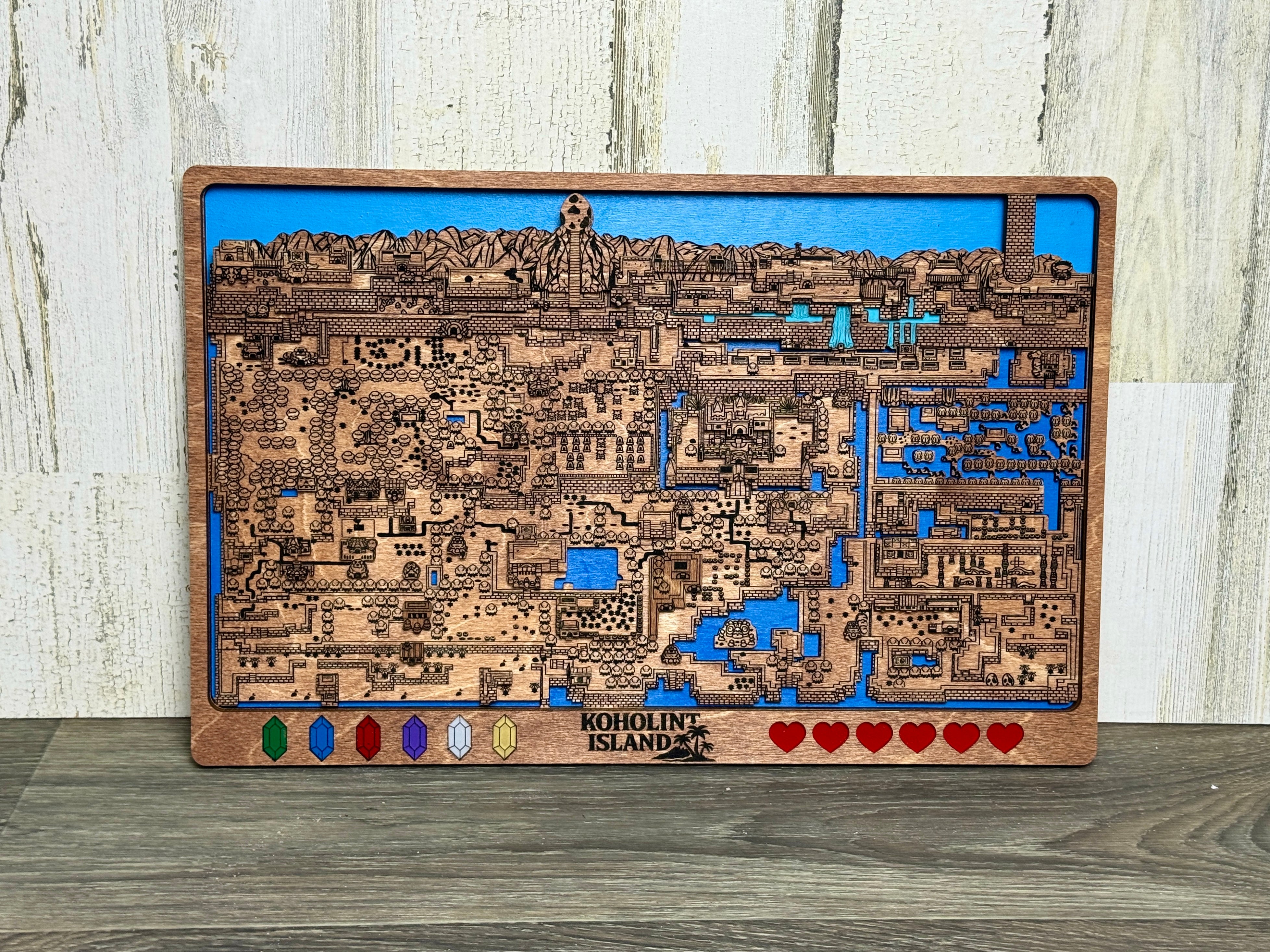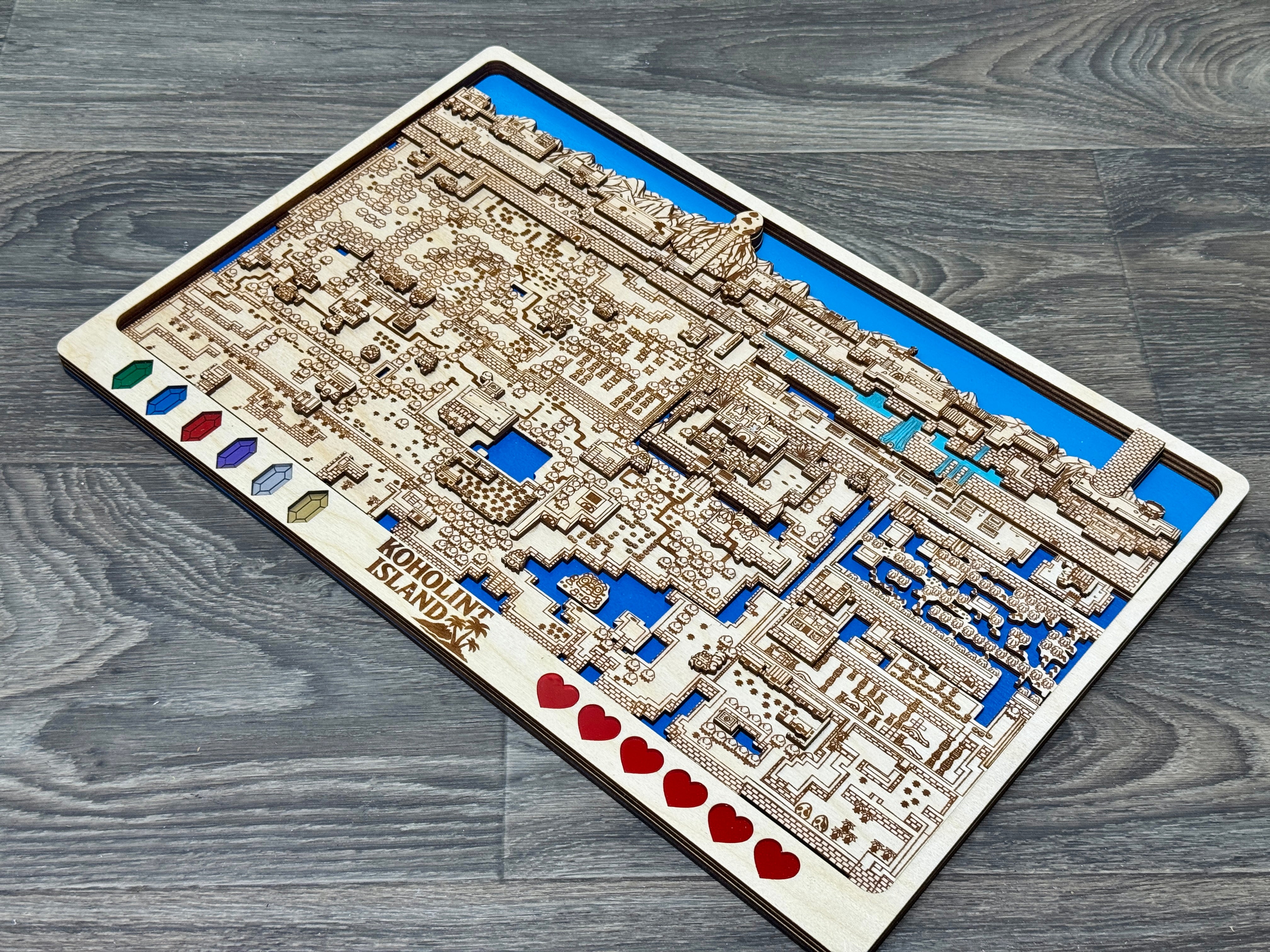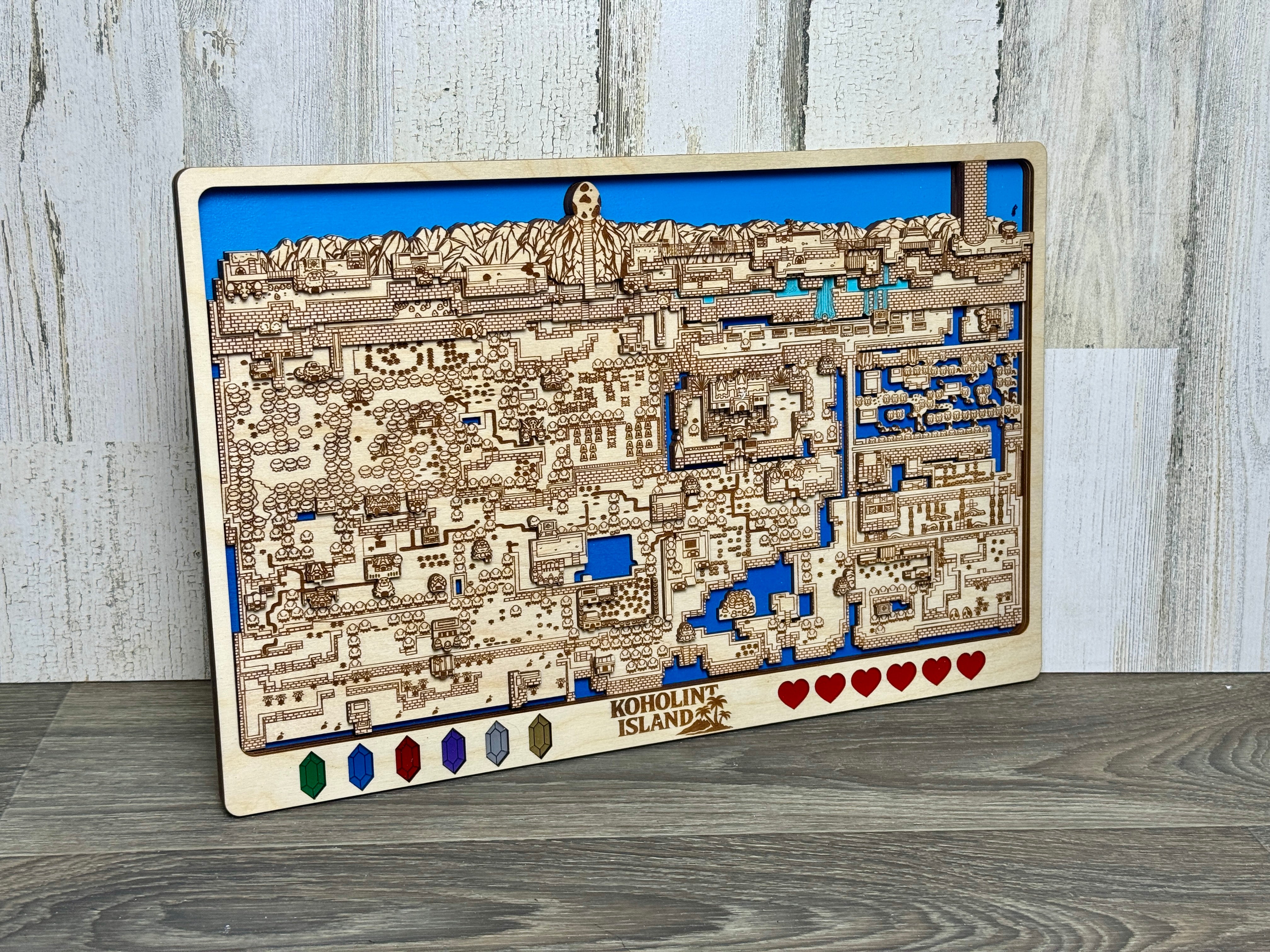 Treat yourself to a hand made unique item of art for your home. This amazing piece of art is inspired by the Legend of Zelda Series. It is a multi layered 3d map of dreamy Koholint Island made of 5 unique layers of wood with custom, hand painted acrylic remakes of the hearts and rupees lining the bottom of the frame