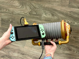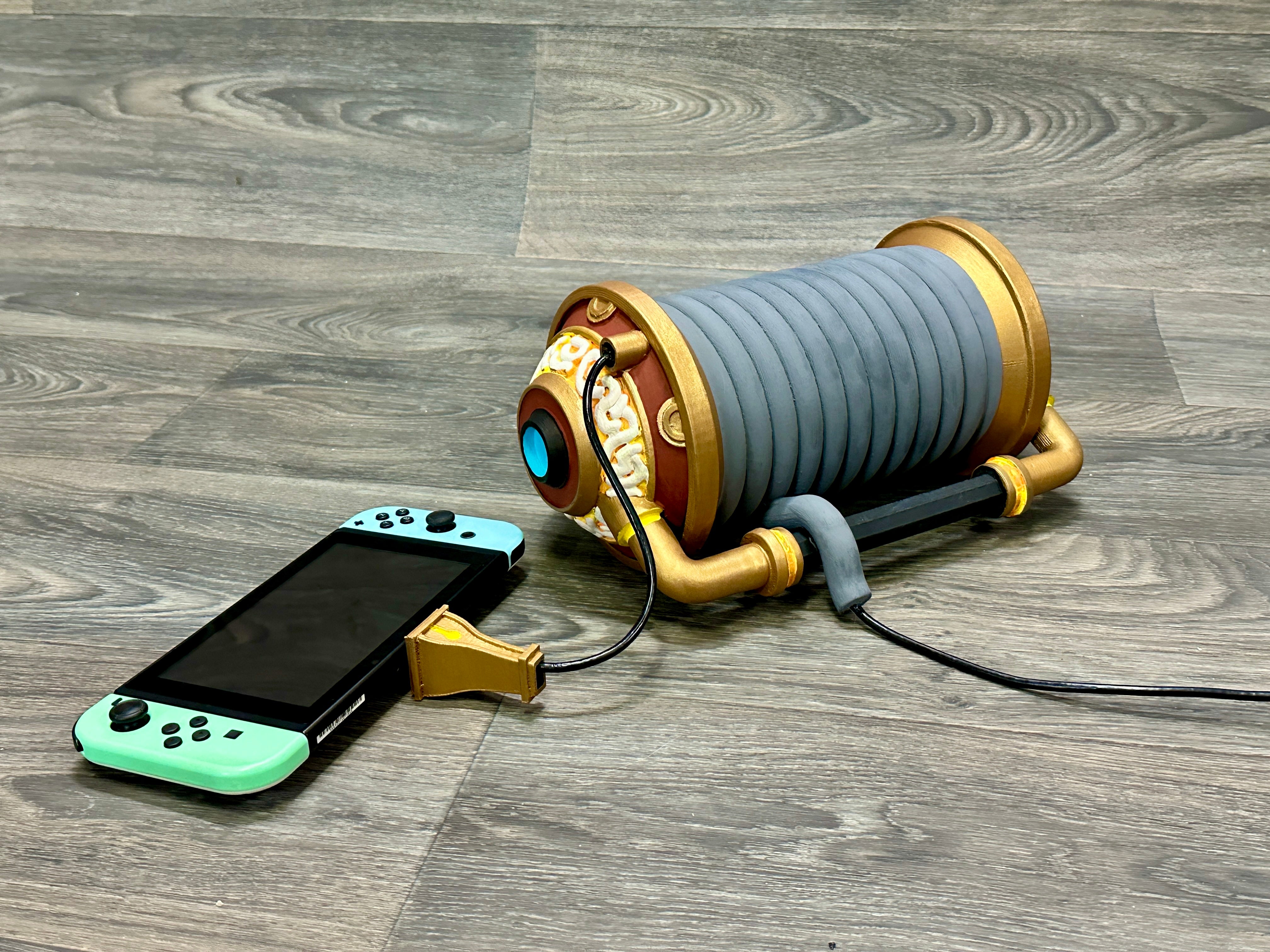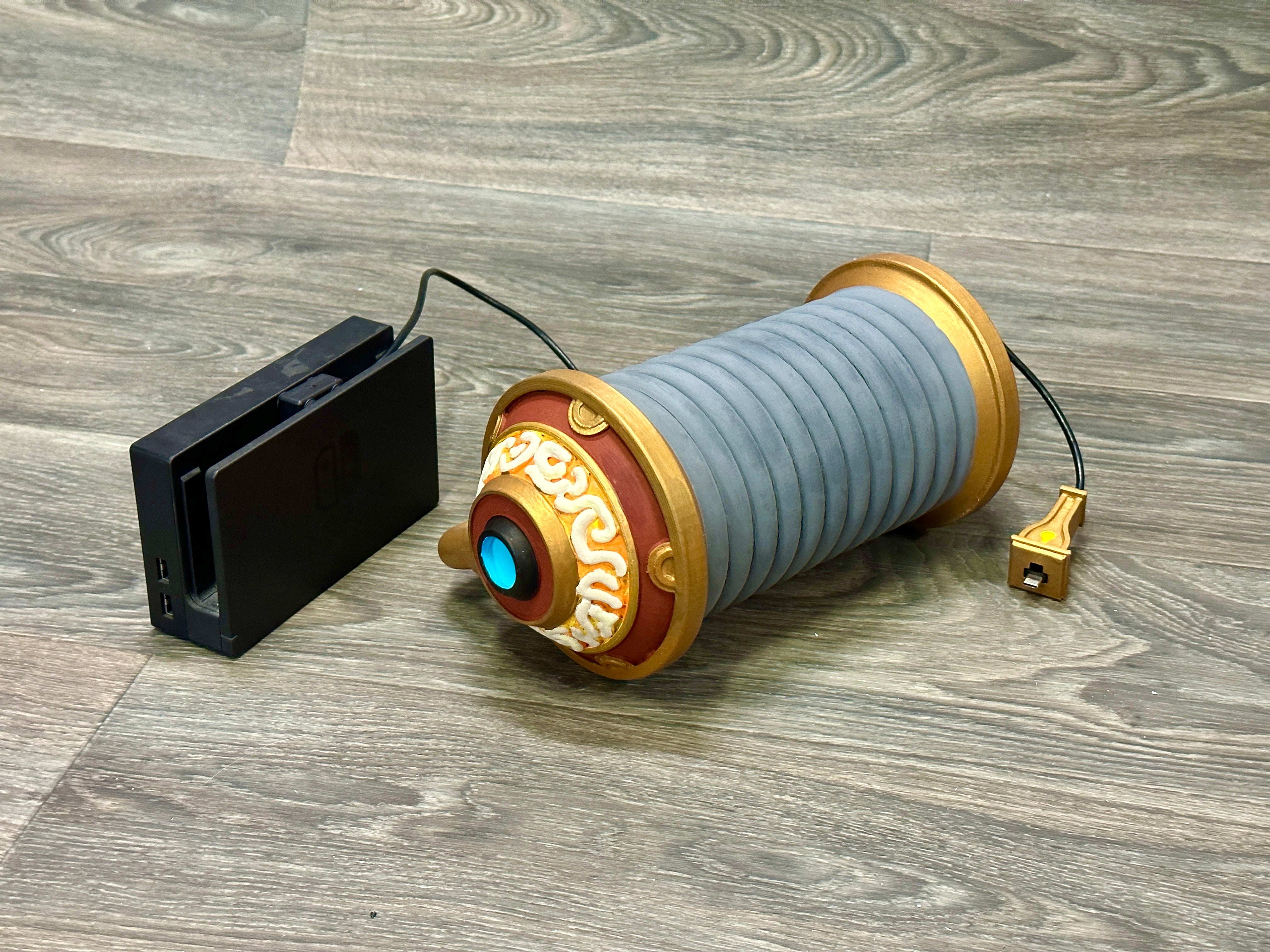 This is an entirely 3d printed version of the data cable spool used at Skyview Towers from the latest Zelda game that works as a TV dock for the Switch. In TotK this is strapped to Link at the base of every Skyview Tower and connected to his signature Purah Pad to transmit all the location data down from the sky & update his map with tons of new detail. Now you can add this to your entertainment center & connect your Switch to the dock in a completely unique way!