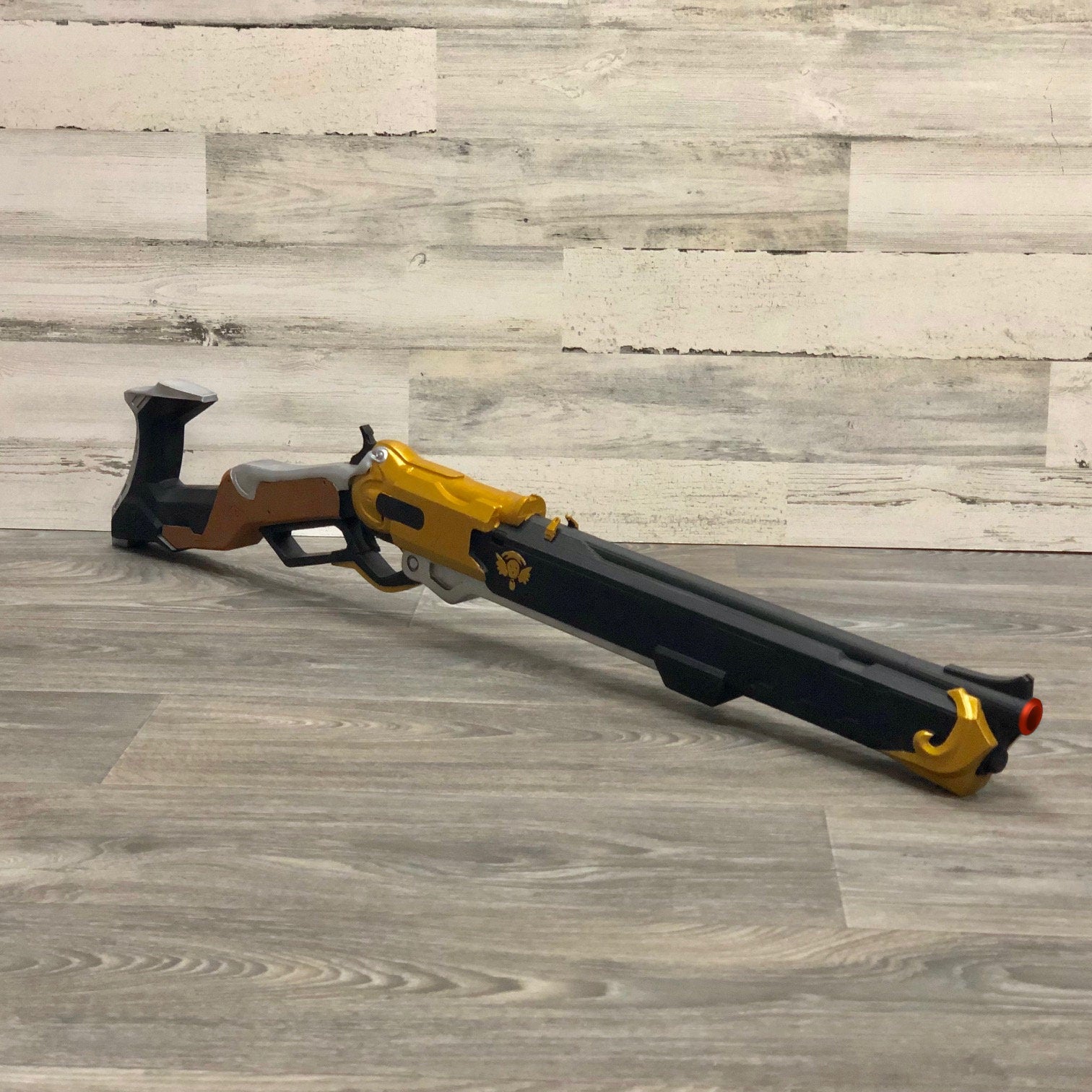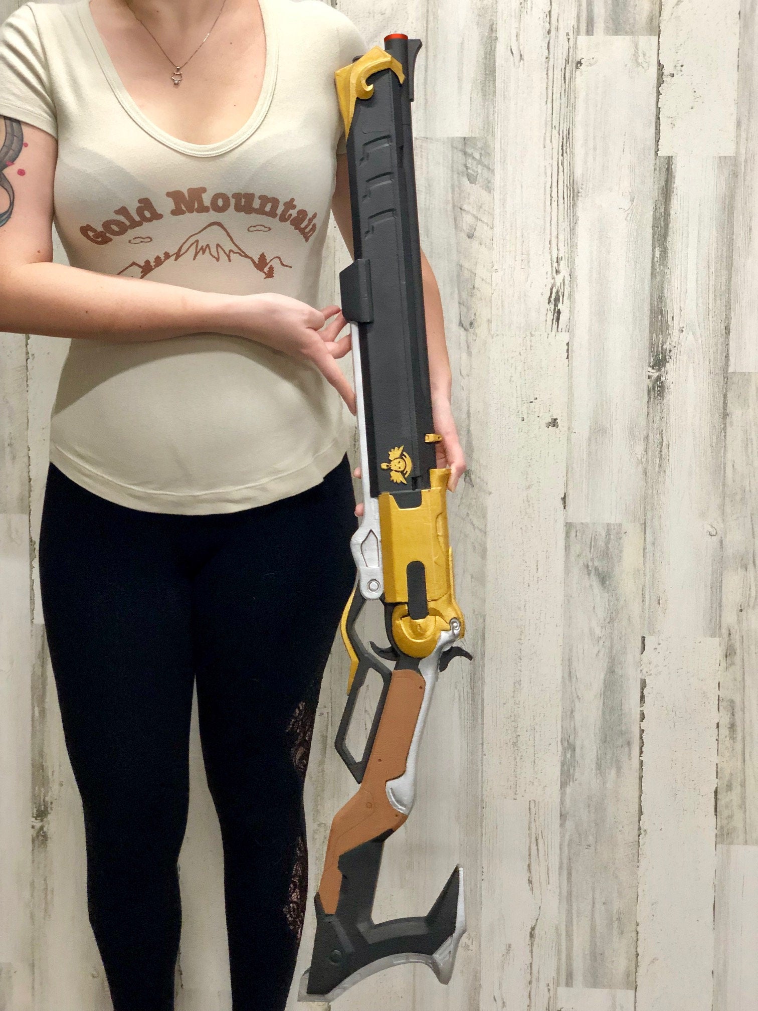 This is a full scale, entirely 3d Printed replica inspired by the character Ashe's gun. Made of abs plastic, this is very durable and fully hand painted and coated to last. This is a highly detailed model that is perfect for cosplay and display purposes. There is a painted and unpainted version of this and it comes completely assembled! The painted it as photographed and the unpainted is the same shape and size, only all white instead for you to paint yourself!