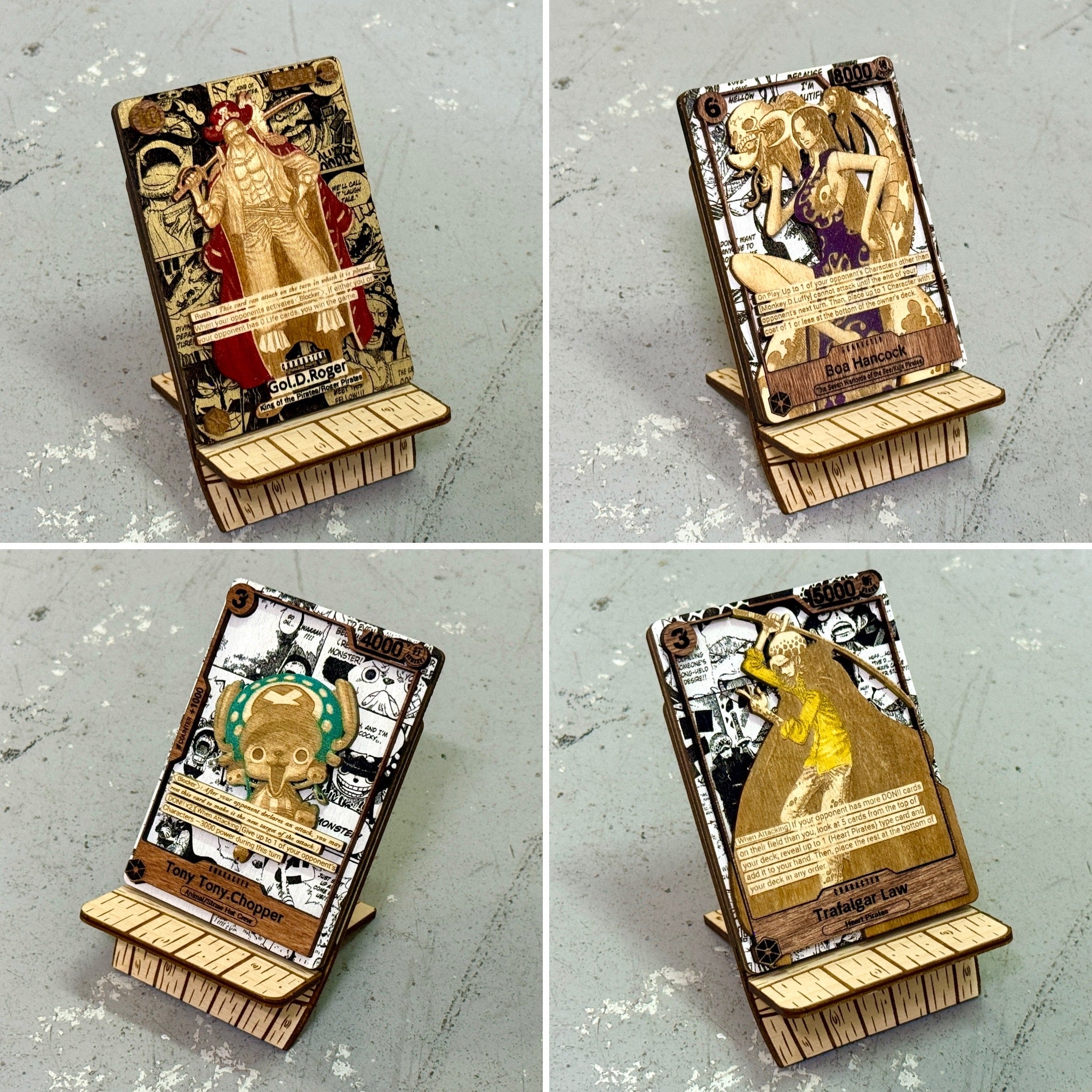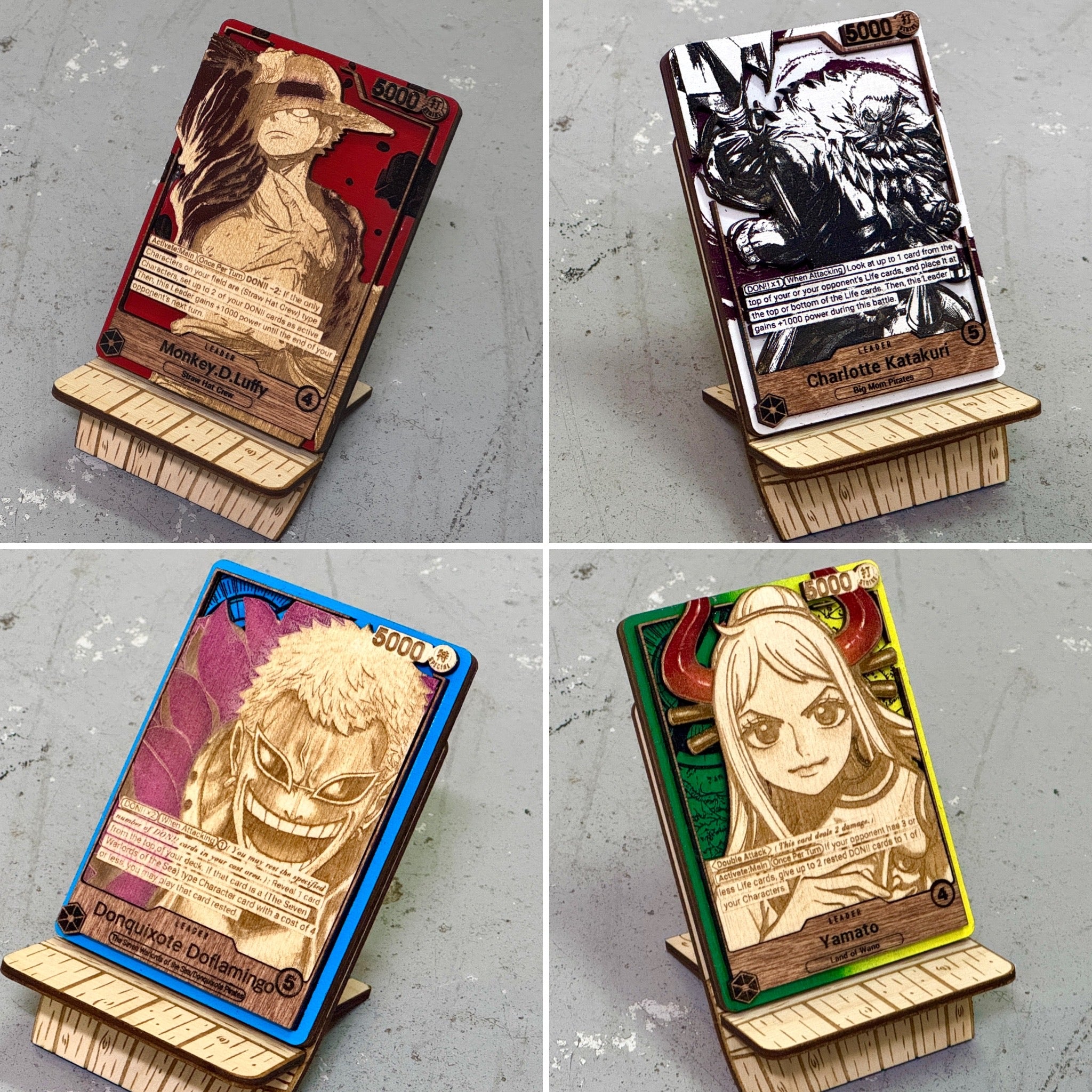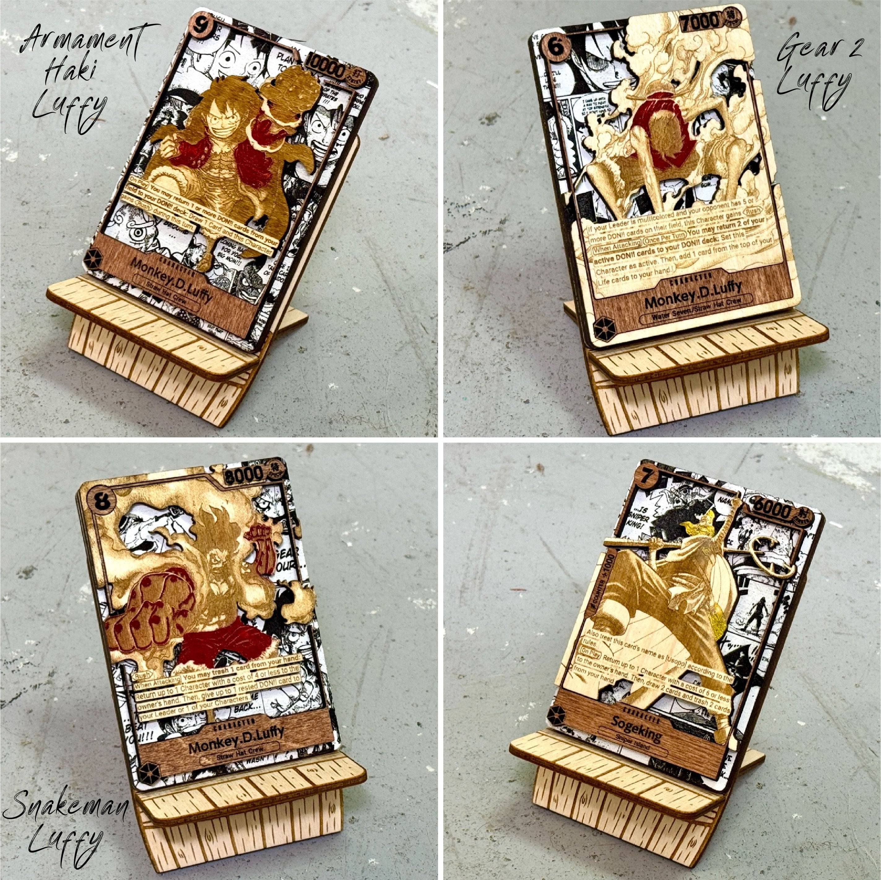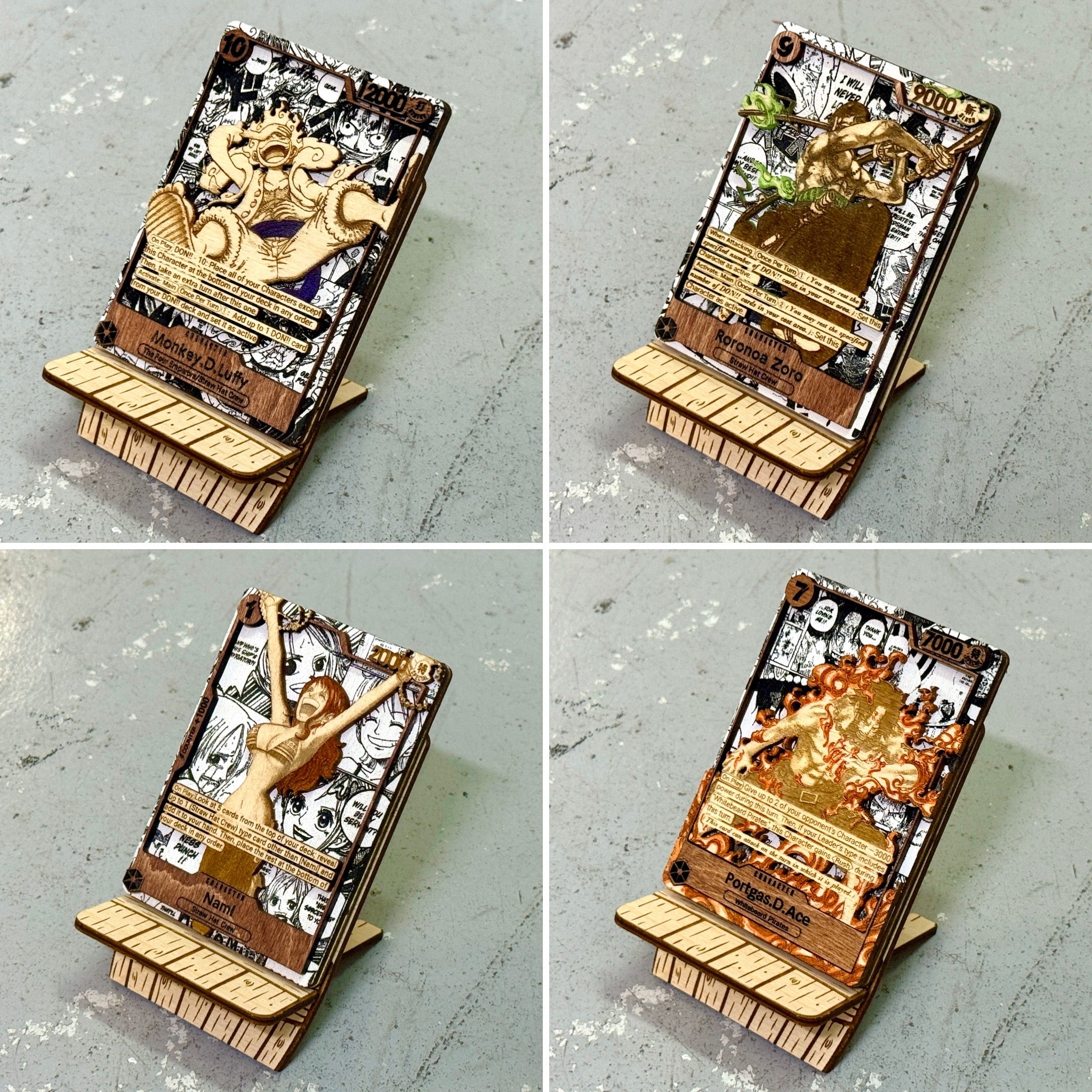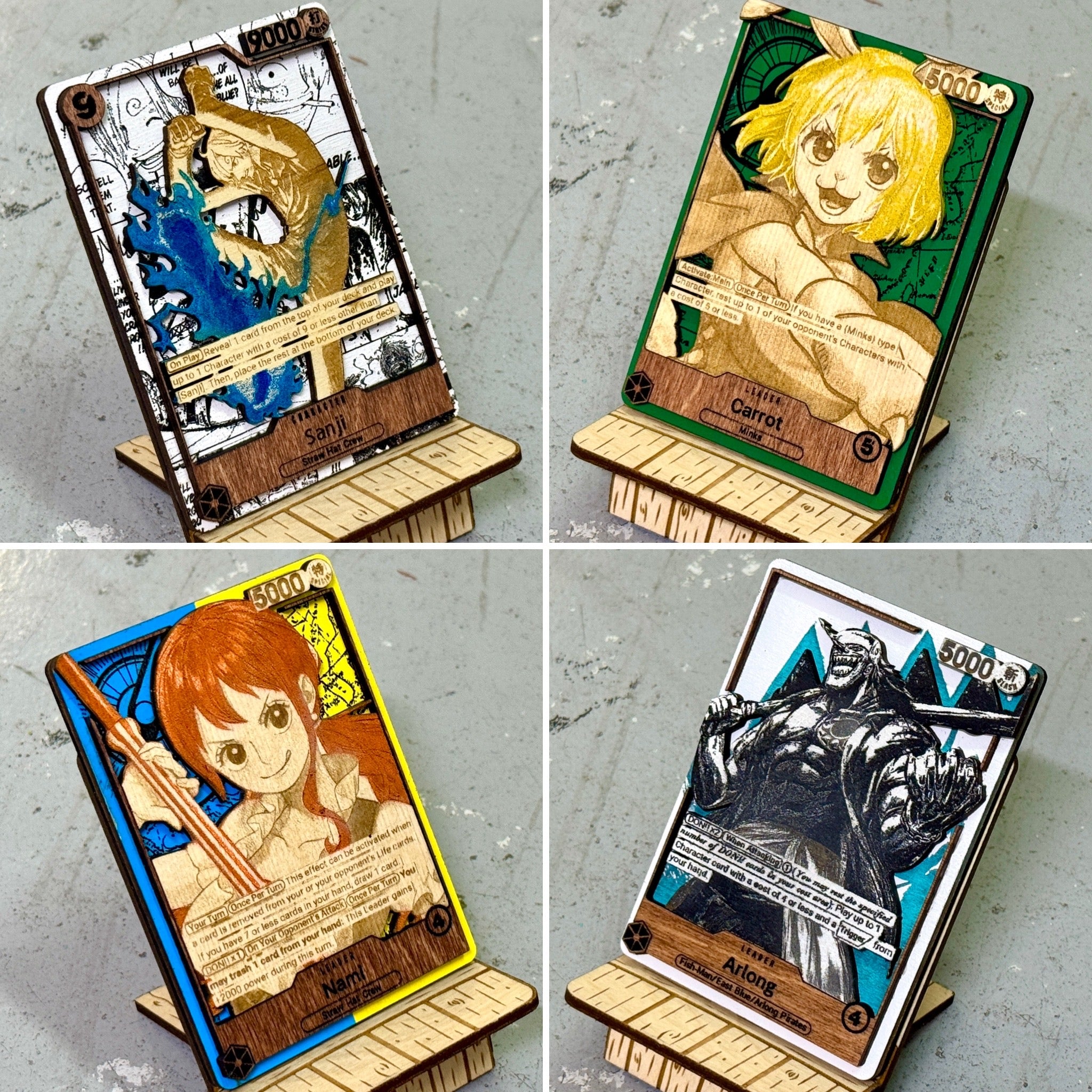 These are hand-assembled, multi-layered 3D wooden trading card replicas designed after the Manga Rare editions found in the popular One Piece anime trading card game. Each card is carefully laser cut, engraved, and hand-painted to highlight the detailed artwork and manga-style background.