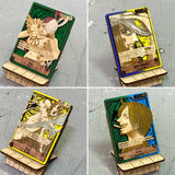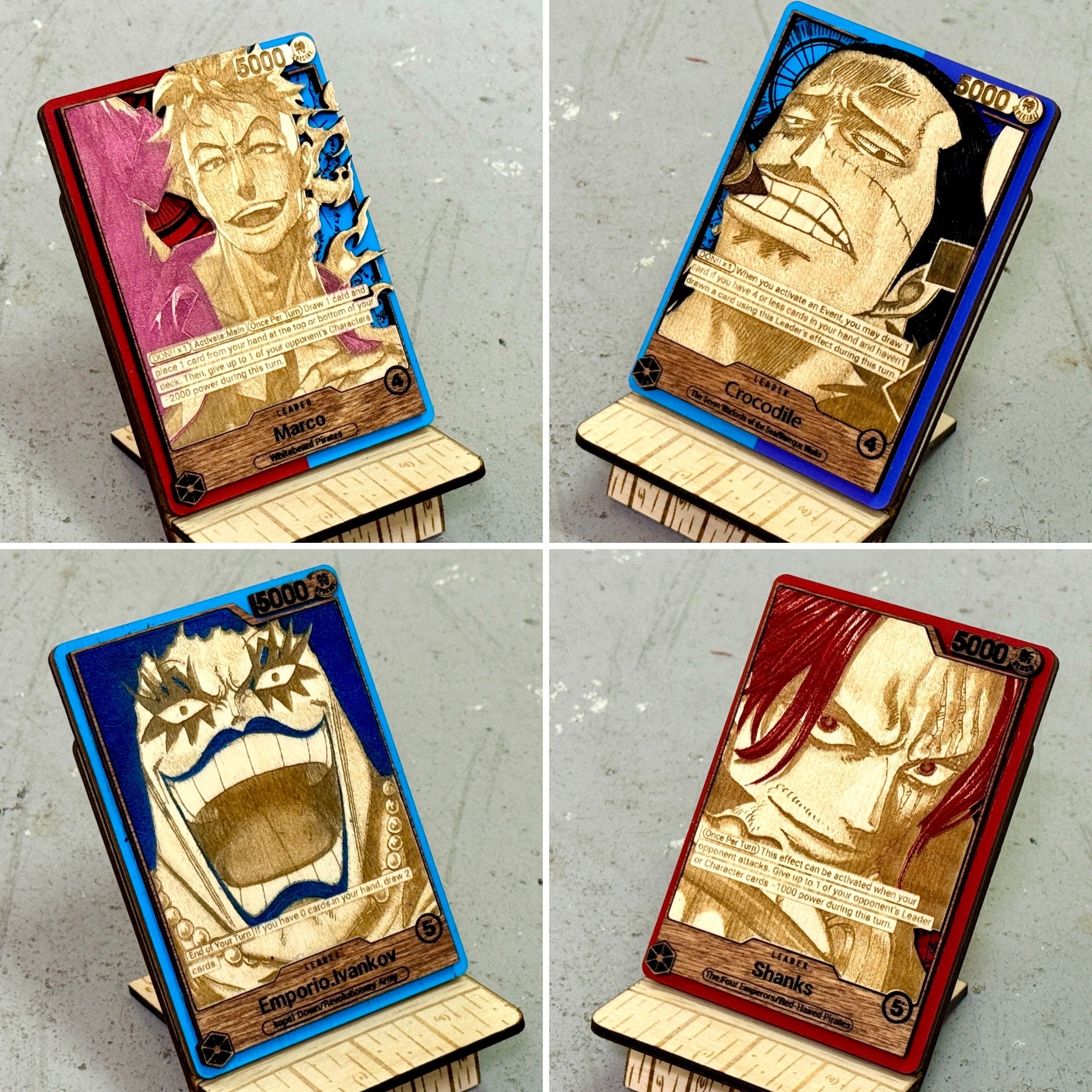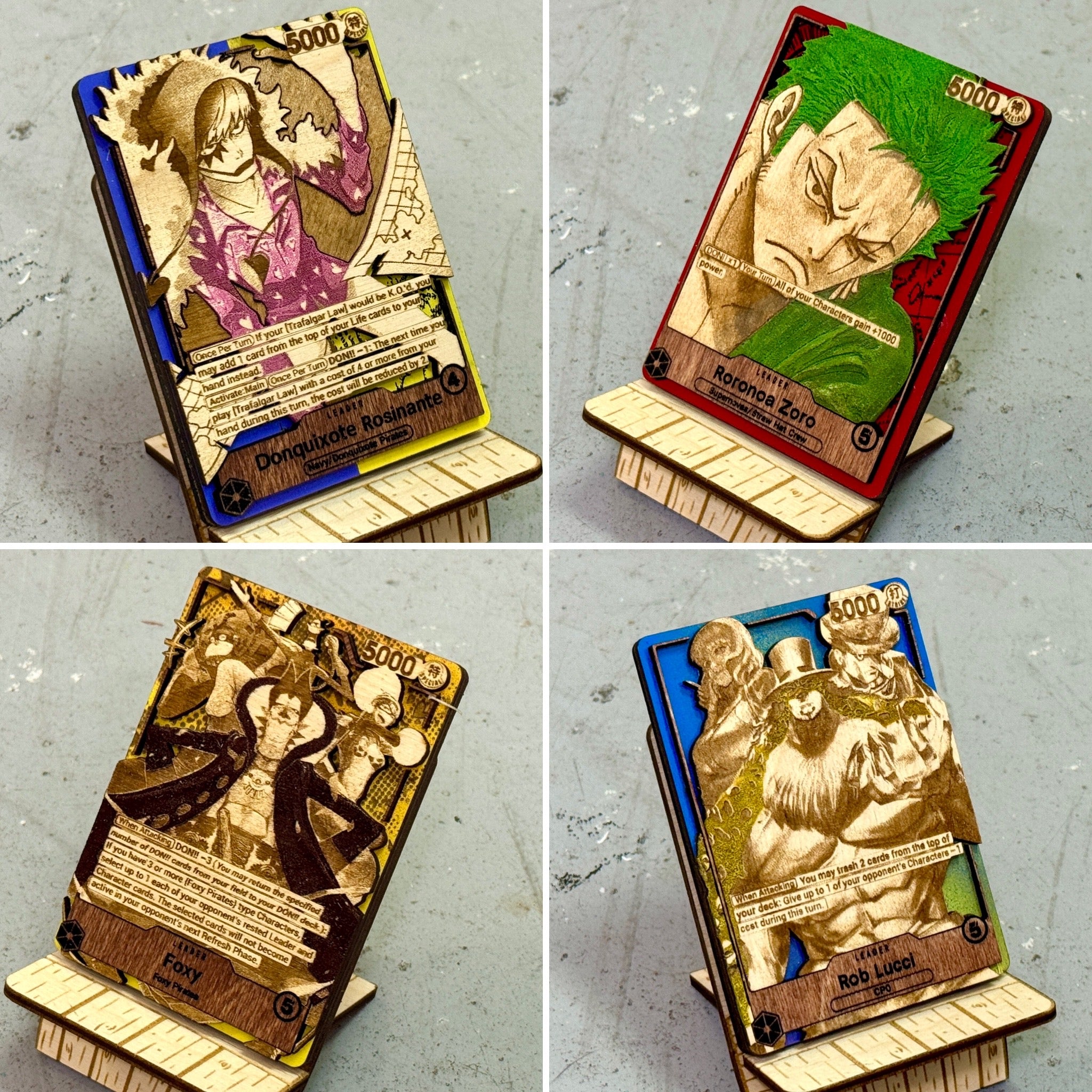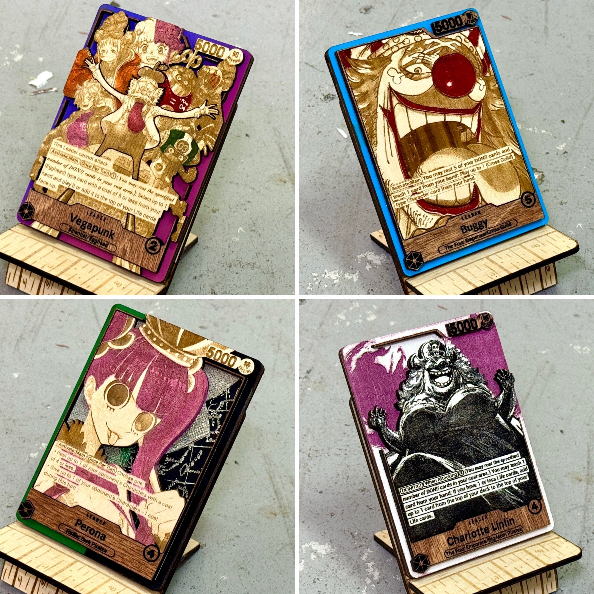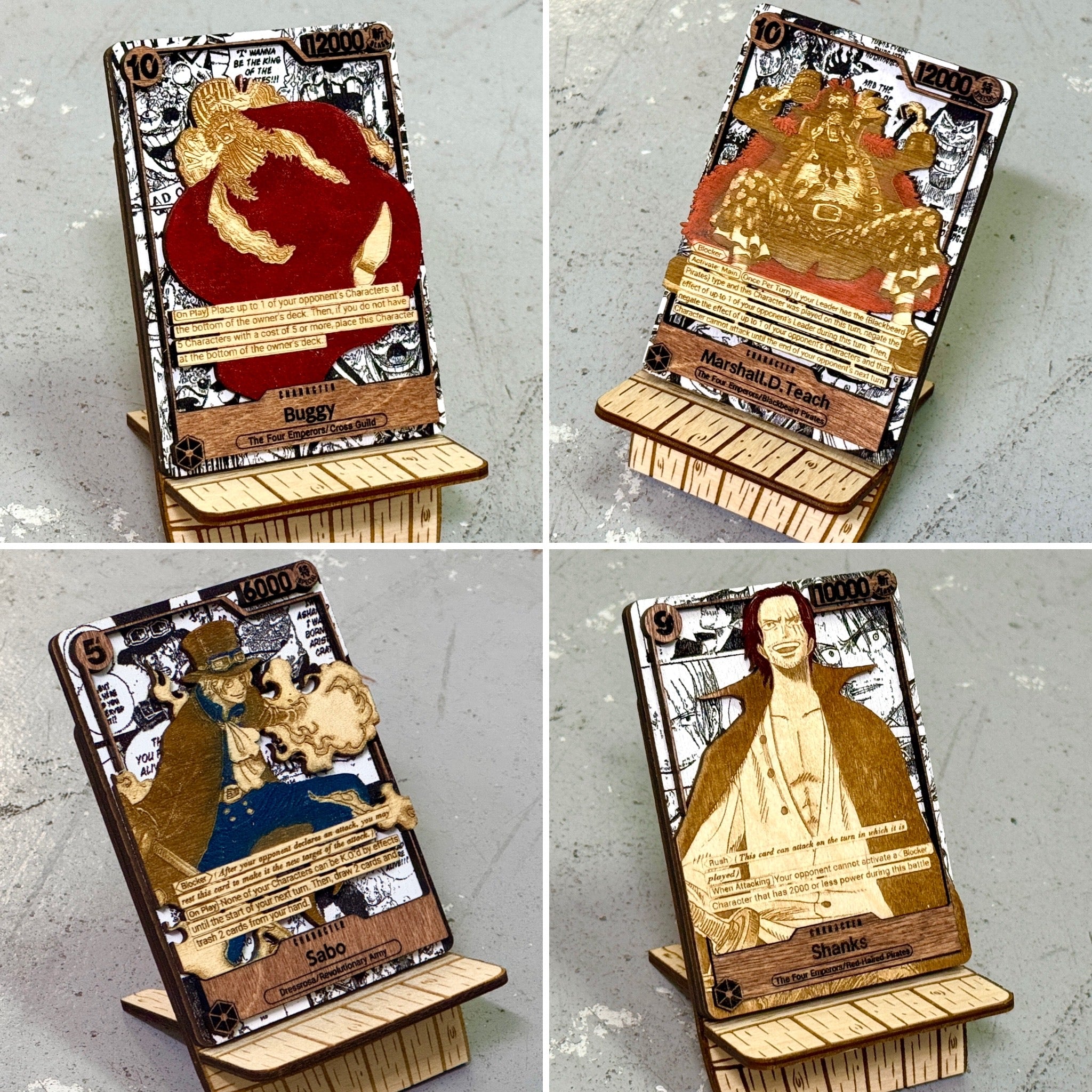 These are hand-assembled, multi-layered 3D wooden trading card replicas designed after the Manga Rare editions found in the popular One Piece anime trading card game. Each card is carefully laser cut, engraved, and hand-painted to highlight the detailed artwork and manga-style background.