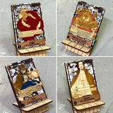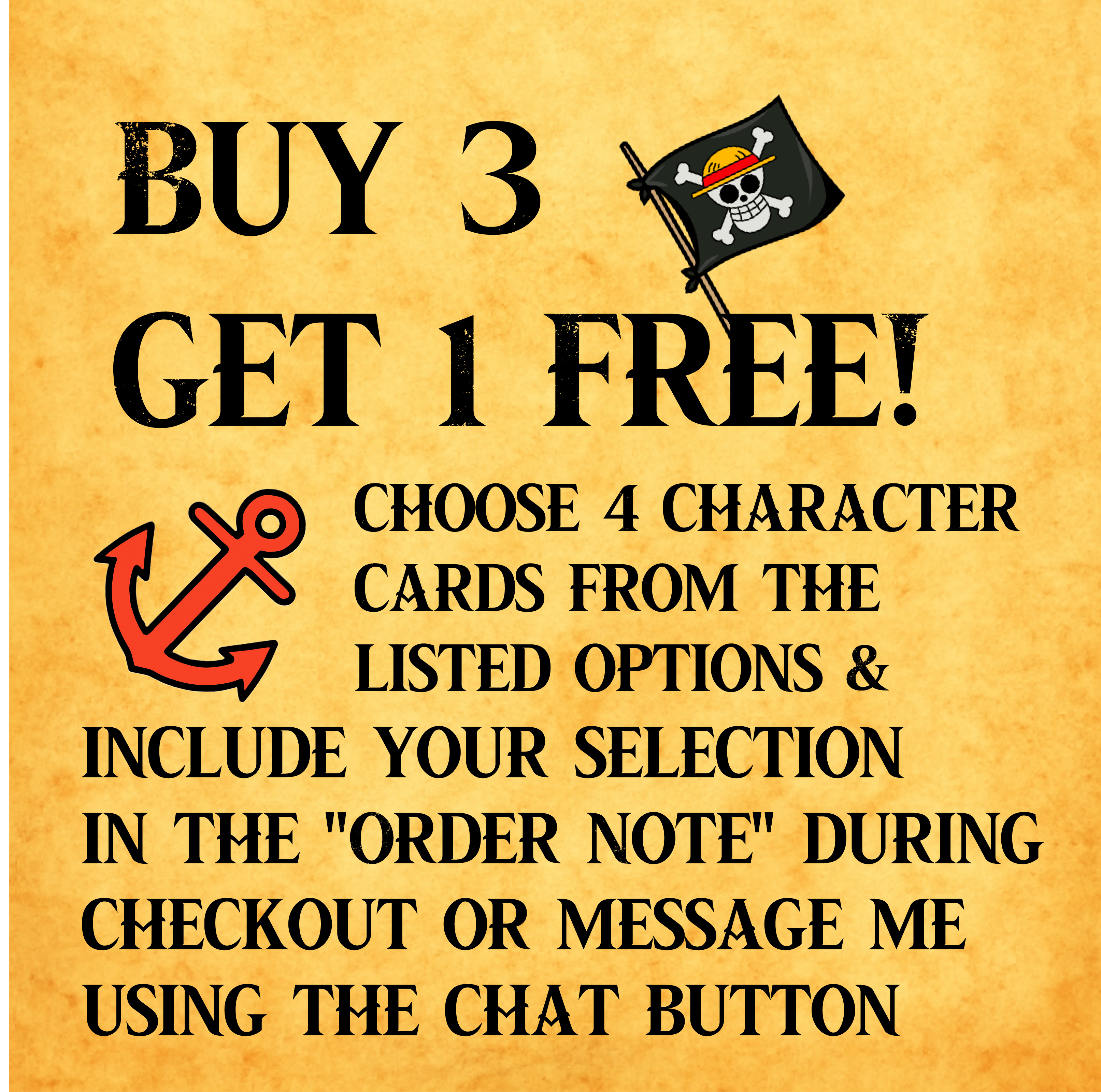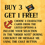 Each card measures approximately 3 inches wide by 4.2 inches tall, with a solid 3/8 inch thickness for a durable, display-ready finish. These also come with a stand for each one featuring an engraved pirate ship-theme & the Jolly Roger emblem matching each character.