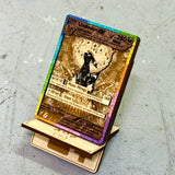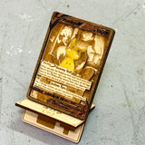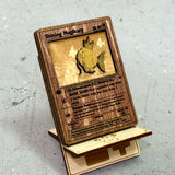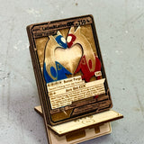 These are hand-assembled, multi-layered 3D wooden trading card replicas designed after standout cards from the monster-collecting trading card game. Each card is carefully laser cut, engraved, and hand-painted to highlight the detailed artwork and layered background effects.