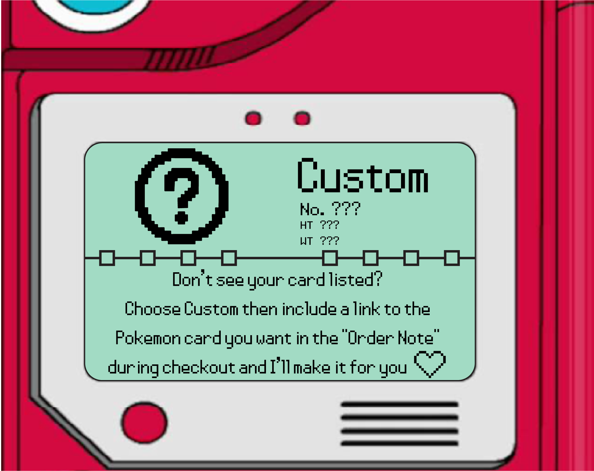 Don’t see your card listed? Choose Custom, paste a link to a clear photo of the Pokémon card you want (any set, era, or language) in the "Order Note" during checkout and I’ll make it for you. I can recreate almost any card, from vintage designs to e-reader layouts to modern full arts, so you can get the one you love!